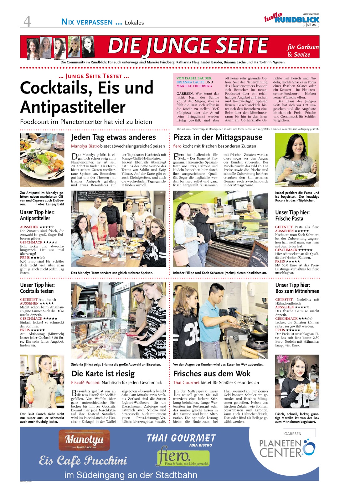 Ein paar Male habe ich es nun schon erwähnt - ich arbeite als freie Mitarbeiterin bei einer Zeitung! Dort haben wir ein Format das sich 'Junge Seite' nennt, mit freien Themen für unsere jüngeren Leser, also Rezepte, Kinotipps und was einen noch so interessiert, ähnlich also wie ein Blog nur in gedruckter Form:) Über meinen und über euch habe ich dort auch schon berichten! Nun haben wir uns für die Junge Seite eine neue Kategorie überlegt: 'Junge Seite testet!'. In einem Einkaufszentrum in der Nähe, dem Planetencenter, durften wir uns für den ersten Bericht durch die Lokale testen. Da natürlich nicht jeder überall etwas essen konnte, haben wir uns aufgeteilt und jeder hat woanders etwas probiert. Zum Nachtisch im Eiscafé haben wir uns dann aber alle zusammen gefunden ! Für den Bericht war das Eiscafé meine Aufgabe, von daher durfte ich dort auch einmal hinter die Kulissen schauen und meinen eigenen Eisbecher kreieren. Das Eis aus seinen Behältern zu kratzen war gar nicht so leicht, wie es immer aussieht. Geschmeckt hat es dann natürlich trotzdem und solltet ihr in der Nähe wohnen, solltet ihr dort auf jeden Fall mal vorbei schauen!